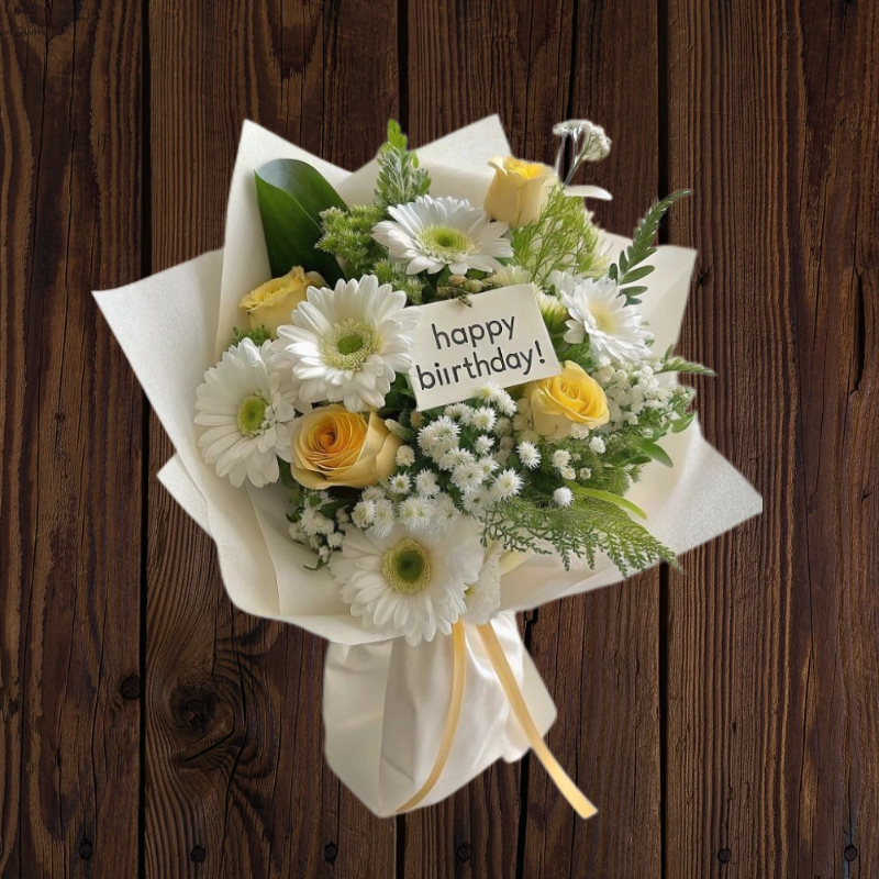 Soft, sunny, and sweeter than frosting — Lemon Drop Hugs is the perfect birthday bouquet to light up their day. Featuring cheerful white gerbera daisies, buttery yellow roses, dainty baby’s breath, and fresh greenery, it’s all wrapped in crisp white paper and tied with a sunny yellow ribbon for that extra pop.