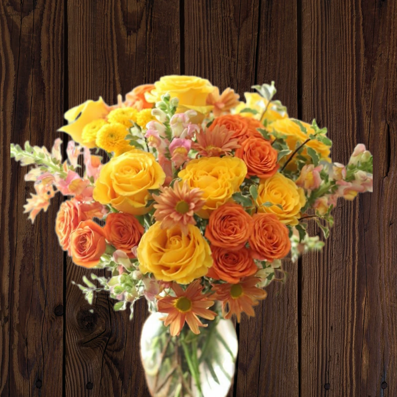 Brunch vibes, bottled in a bouquet. Mimosa Moods is a bright and bubbly arrangement bursting with golden yellow roses, sunny orange blooms, and layers of lush texture from ranunculus or chrysanthemums — all styled to capture that irresistible mid-morning glow.
